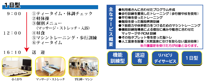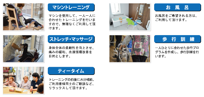 歩行訓練を中心とした機能訓練に特化した1日型デイサービス 出来る限り自分のことは自分でいつまでも ○自立した生活をしたい! ○転倒を予防したい! ○痛みや痺れを緩和したい! ○効果的なリハビリをしたい! など、お悩みの方におすすめ致します。 |